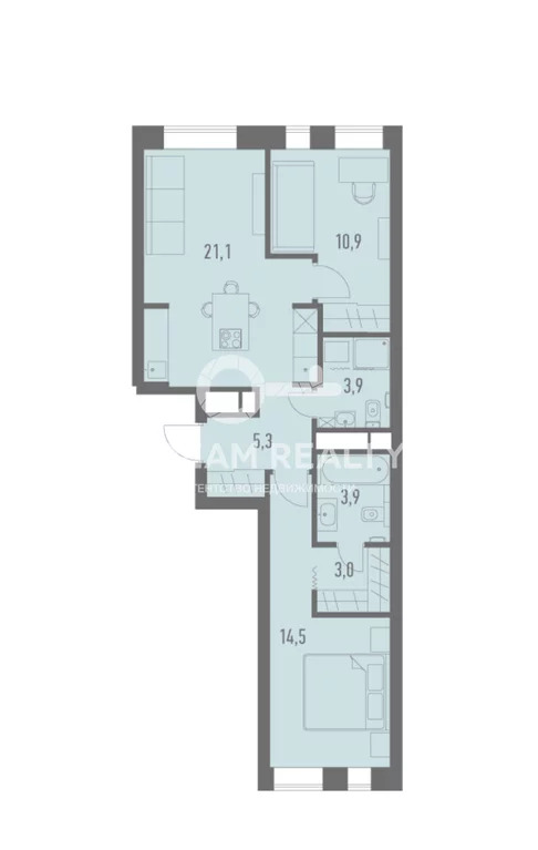 Вашему вниманию предлагается двухкомнатная квартира общей площадью 62,6 кв.м, с кухней-гостиной 21,1 кв.м, мастер-спальней 14,5 кв.м. с выходом в гардеробную и личный сан.узел, детской/кабинетом 10,9 кв.м. и вторым сан.узлом.
