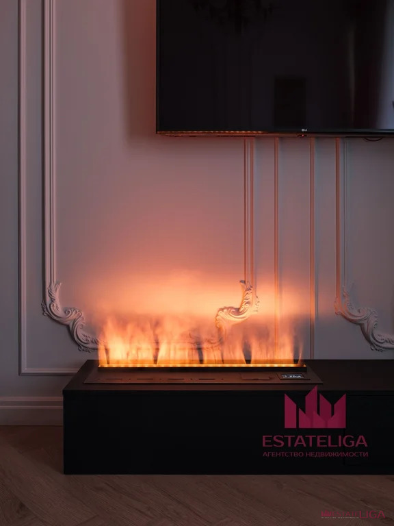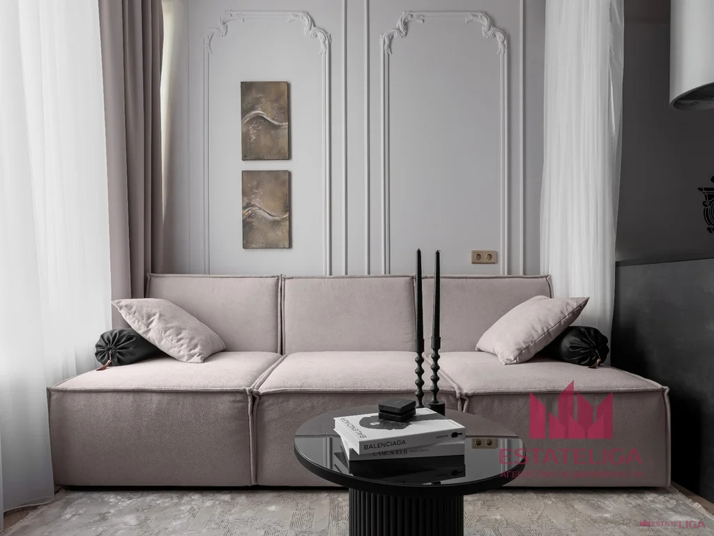 80% всей мебели в квартире - это заказные позиции по эскизам дизайнера. Мягкая мебель изготовлена в итальянской ткани со СМАРТ-наполнителем, принимающем положение тела (принцип анатомического матраса). Кухня оснащена всей необходимой техникой, выдвижные фасады с доводчиками, а в ТВ-тумбе спрятан встроенный паровой камин с функцией увлажнения воздуха. Текстиль - производство Бельгия и Турция. Потолок - ГКЛ, покрашен влагостойкой краской в цвет стен (стены можно мыть).