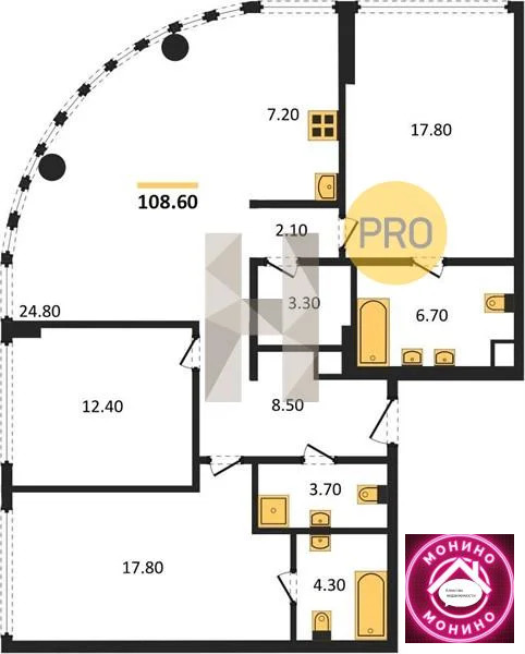 Предлагаются варианты квартир с эркерами, террасами и панорамным радиусным остеклением. Высота потолков на типовом этаже составляет 3,1 м, на верхнем — шесть метров.