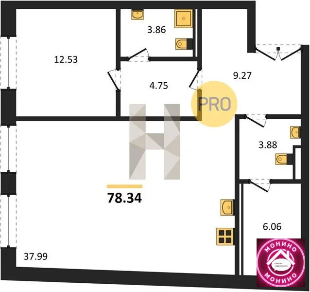 - Площадь комнат участвующих в сделке, м²12.53