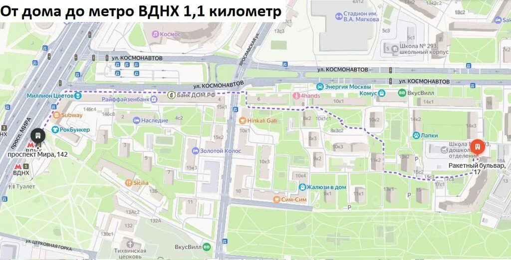 Удобная транспортная доступность: от дома до автобусной остановки 130 метров, до платформы Маленковская 800 метров, до метро ВДНХ 1,1 километр.