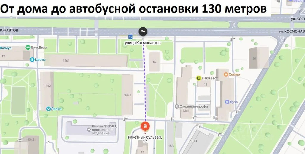 Удобная транспортная доступность: от дома до автобусной остановки 130 метров, до платформы Маленковская 800 метров, до метро ВДНХ 1,1 километр.