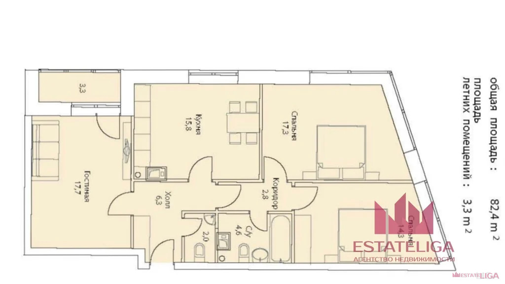 Общая площадь 82,4 м.