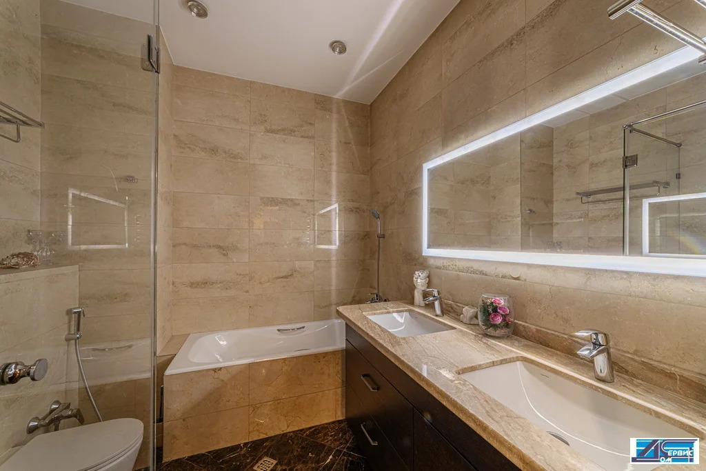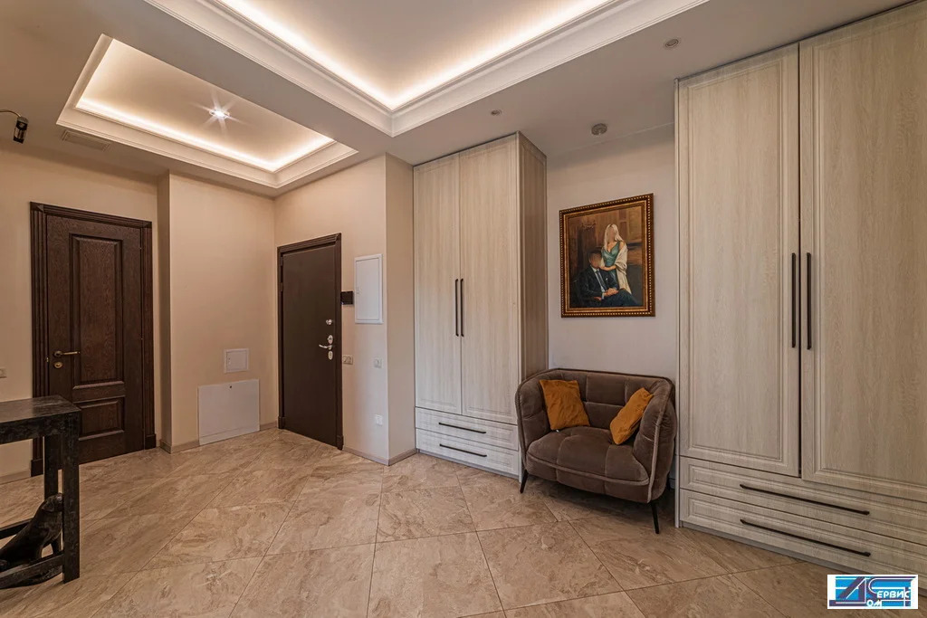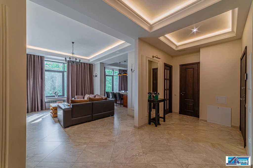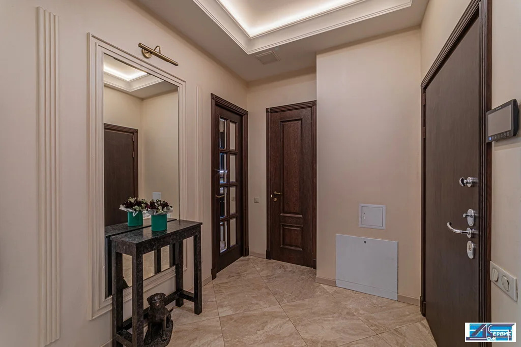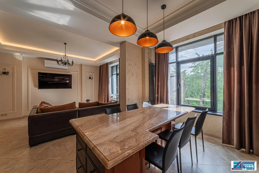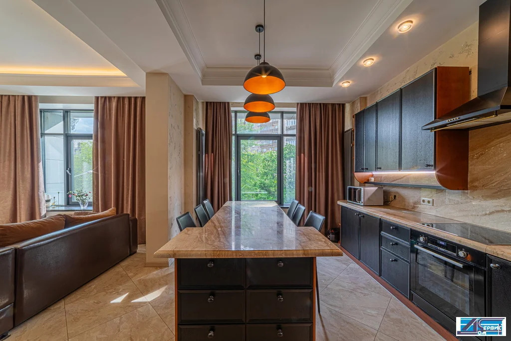 В квартире функционально-продуманная планировка: просторная кухня 16 кв. м, гостиная 20 кв. м, 3 изолированные спальни (19+16+14,5), 3 с/у, гардеробная, постирочная. При ремонте использовались премиальные отделочные материалы, итальянский мрамор, натуральный деревянный паркет, швейцарская сантехника.