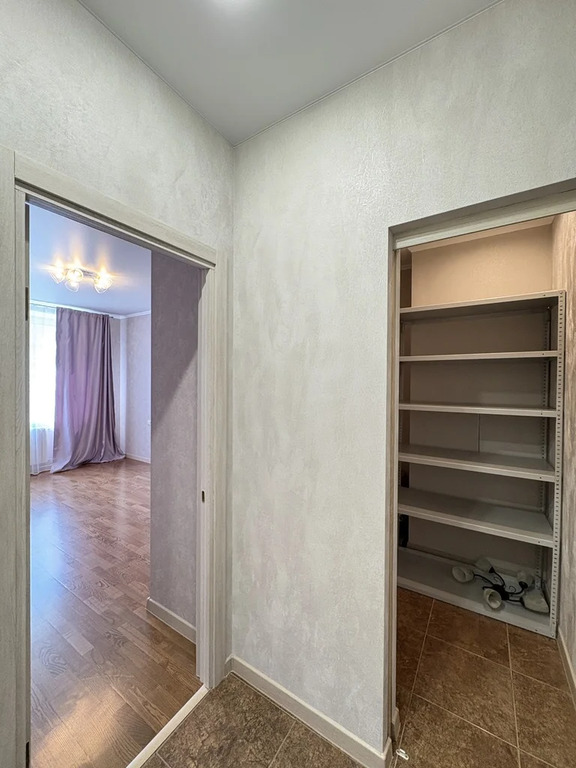 Удобная планировка. Гардеробная, кухня-гостиная и спальня. В квартире изначально было два санузла, вместо одного из них сделана гардеробная, которая немного увеличена за счет комнаты. Кухня увеличена за счет лоджии. Стена с оконным блоком была ненесущая. В результате чего появилась возможность зонировать кухню на зону кухни и зону гостиной. Планировку не узаконивали, т.к. не было такой необходимости. Квартира теплая, зимой радиаторы отопления обычно выключались, с включенными было жарко. Летом, даже в жару, в квартире комфортная температура.