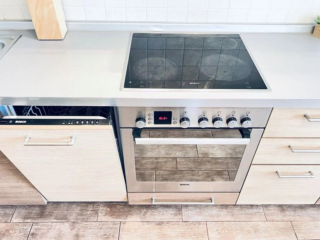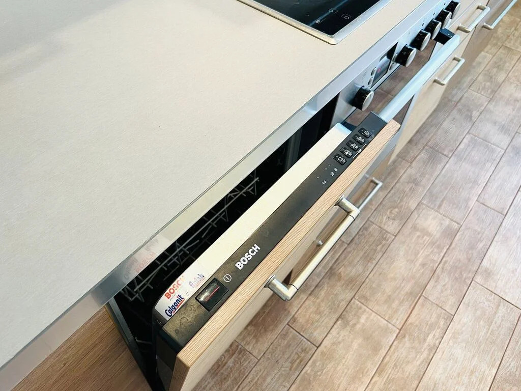 КУХНЯ оснащена современным гарнитуром с обилием шкафов и секций, вся встроенная техника BOSCH (духовка, варочная панель, микроволновка, посудомоечная машина, холодильник), обеденный гарнитур.