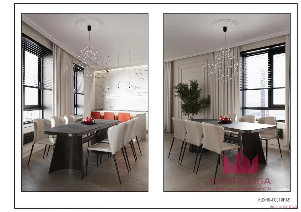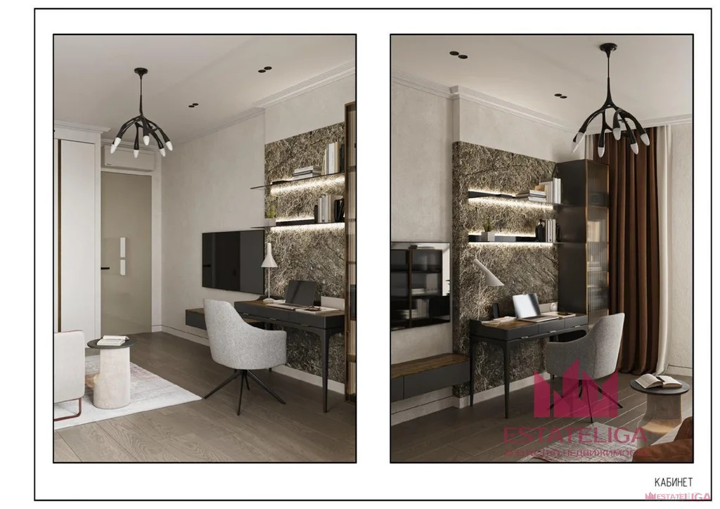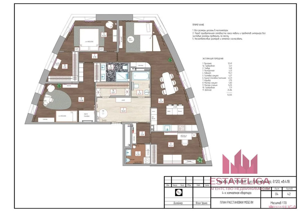Планировка включает в себя просторную кухню- гостиную, 4 изолированные комнаты, 3 санузла и большую гардеробную.
