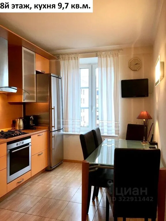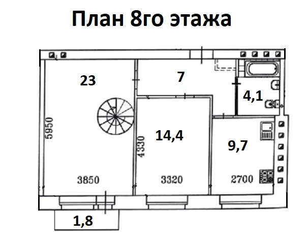 Площадь 8го этажа квартиры 61 кв.м. с учетом балкона. Комната 23 кв.м. (диван, настенные полки, столик, зеркало, люстра) с выходом на балкон 1,8 кв.м. и лестницей на чердачный этаж, спальня 14,4 кв.м. (кровать, кондиционер, шкаф, комод, люстра) кухня 9,7 кв.м. (кухонный гарнитур, плита холодильник, телевизор, лампа настенная, стол, стулья), коридор 7 кв.м. (встроенный шкаф-купе), душевая 4,1 кв.м. (душевая кабинка, зеркало, раковина).