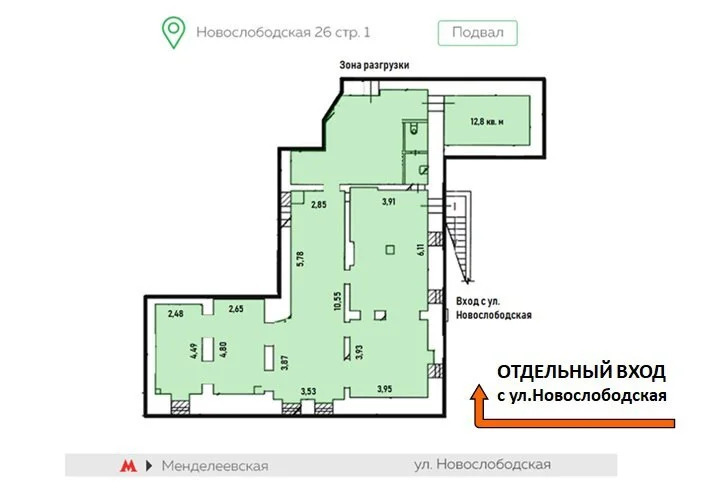 Цокольный этаж бизнес-центра «Новослободская 26» (стр. 1). Отдельный вход с 1-й линии ул. Новослободская — прямой доступ к потоку клиентов!