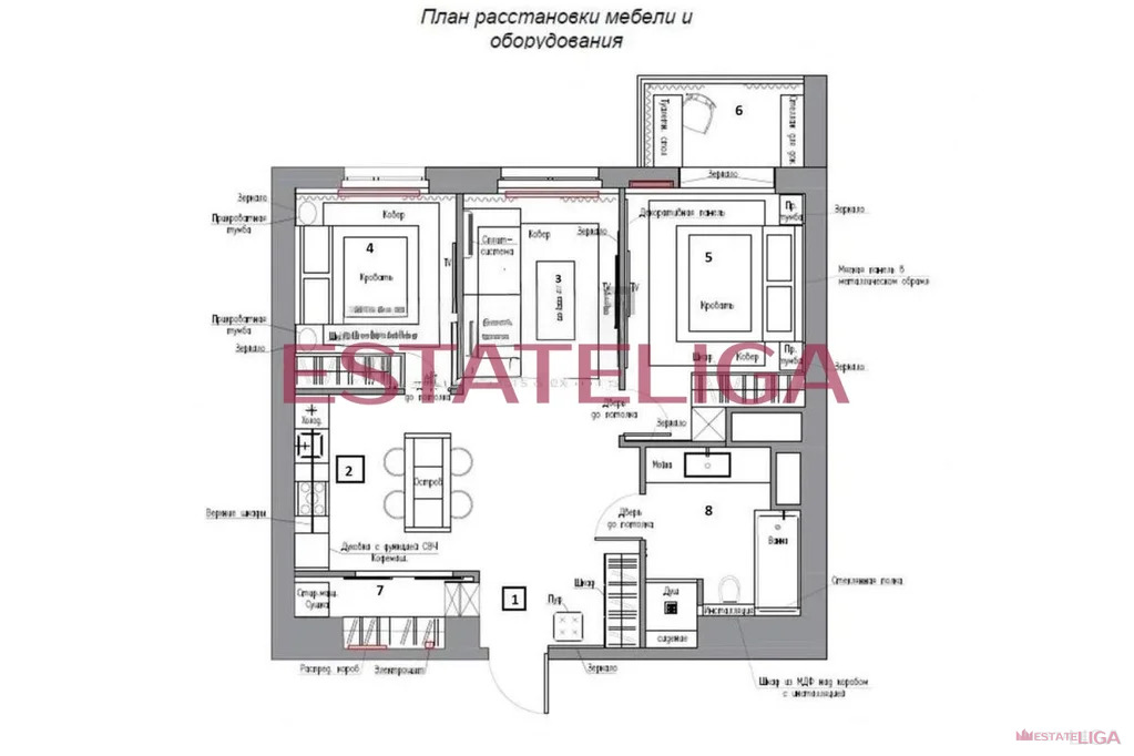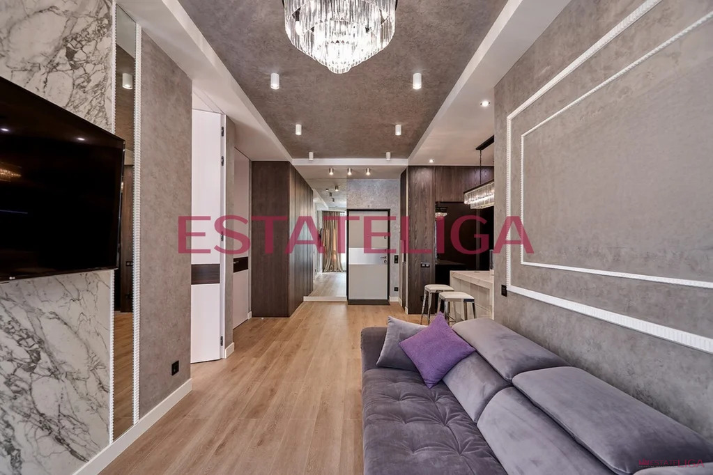 Функциональная планировка апартамента, разработанная по индивидуальному дизайн-проекту: просторная кухня-гостиная, две изолированные спальни, санузел с ванной и душем, гардеробная комната. В каждой зоне оборудованы места для хранения. Кухонная зона плавно перетекает в гостиную, где расположилась ТВ-зона.